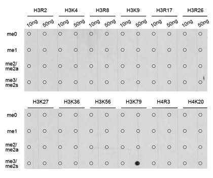 Dot-blot analysis of all sorts of methylation peptides using H3K79me3 antibody.
