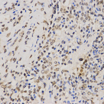 Immunohistochemistry of paraffin-embedded human lung cancer tissue using H3K79me3 antibody at dilution of 1:200 (x400 lens).