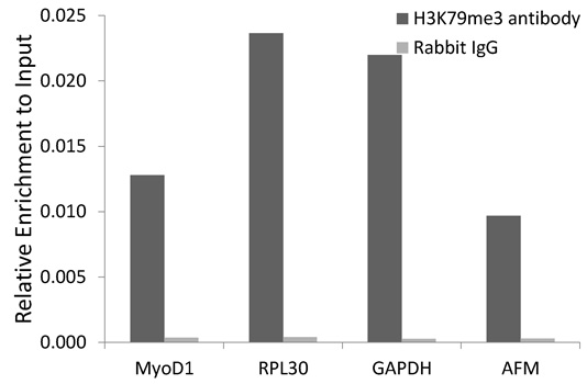 Chromatin immunoprecipitation analysis extracts of 293 cell line, using H3K79me3 antibody and rabbit IgG. The amount of immunoprecipitated DNA was checked by quantitative PCR. Histogram was constructed by the ratios of the immunoprecipitated DNA to the input.