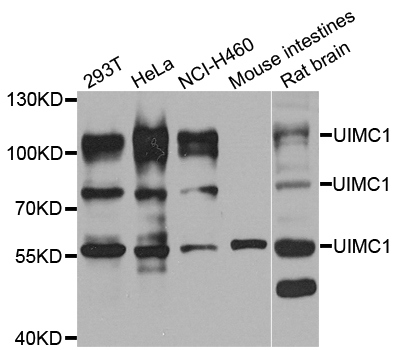 Western blot analysis of extracts of various cell lines, using UIMC1 antibody.