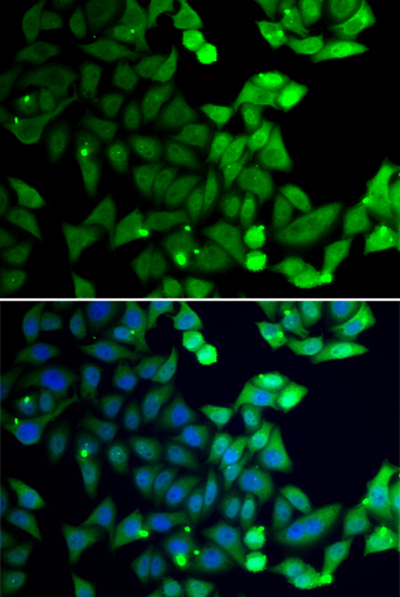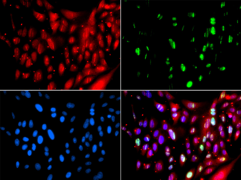 Immunofluorescence analysis of GFP-RNF168 trangenic U2OS cell using UIMC1 antibody. Green:GFP-RNF168 fusion protein expression for DNA damage marker.Blue: DAPI for nuclear staining.RNF168(GFP) can be used to mark cells damaged by UV-A laser for they always gather around DNA damage region.