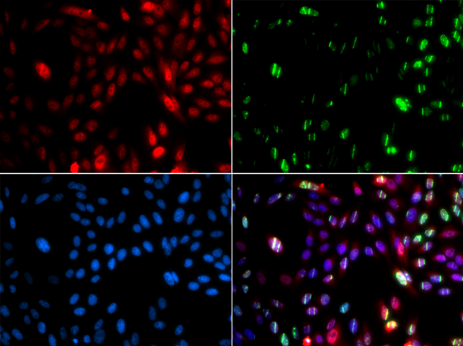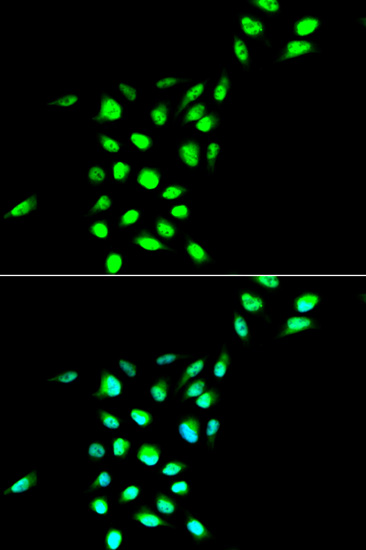 Immunofluorescence analysis of GFP-RNF168 transgenic U2OS cell using VCP antibody.Green:GFP-RNF168 fusion protein expression for DNA damage marker.Blue:DAPI for nuclear staining.RNF168(GFP) can be used to mark cells damaged by UV-A laser for they always gather around DNA damage region.