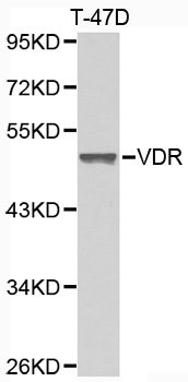 The vitamin D receptor (VDR), also known as the calcitriol receptor, and also known as NR1I1 (nuclear receptor subfamily 1, group I, member 1), is a member of the nuclear receptor family of transcription factors. Upon activation by vitamin D, the VDR forms a heterodimer with the retinoid-X receptor and binds to hormone response elements on DNA resulting in expression or trans-repression of specific gene products.It is an intracellular hormone receptor that specifically binds 1,25(OH)2D3 and mediates its effects. Downstream targets of this nuclear hormone receptor are principally involved in mineral metabolism though the receptor regulates a variety of other metabolic pathways, such as those involved in the immune response and cancer. Defects in VDR are the cause of rickets vitamin D-dependent type 2A (VDDR2A). A disorder of vitamin D metabolism results in severe rickets, hypocalcemia and secondary hyperparathyroidism. Most patients have total alopecia in addition to rickets. This antibody is a rabbit Primary antibodyto human VDR.