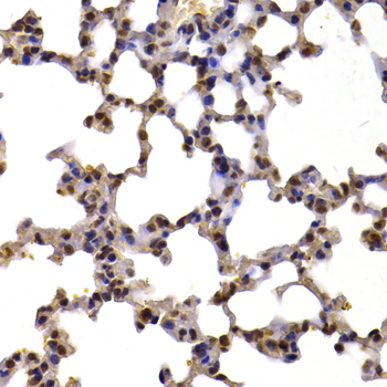 Immunohistochemistry of paraffin-embedded mouse lung using XRCC6 antibody at dilution of 1:100 (x400 lens).
