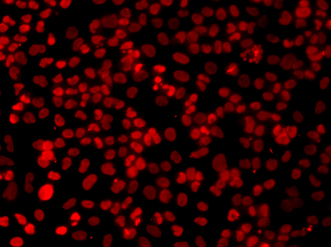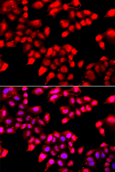 Immunofluorescence analysis of A549 cell using XRCC6 antibody. Blue: DAPI for nuclear staining.