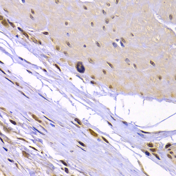 Immunohistochemistry of paraffin-embedded Human leiomyoma of uterus using XRCC6 antibody at dilution of 1:100 (x400 lens).